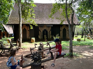 Dans un autre style loufoque, nous nous sommes rendus à la maison noire ou Baan Dam Museum. Ce petit musée, sur une grande étendue de verdure, est plutôt sympathique, mais très étrange. Ce sont des maisons traditionnelles, récentes, en bois et peintes en noir. A l’intérieur on découvre des tableaux qui s’animent en scannant un QR Code. Ça rend la visite plus ludique. Ce qui est étrange, c’est la déco : de grandes tables recouvertes de peaux de crocodiles, de serpents, ornées de crânes en tout genre… Le reste du jardin est tout autant bizarre avec de drôles de sculptures, des bâtiments aux formes inhabituelles… Donc étonnant !