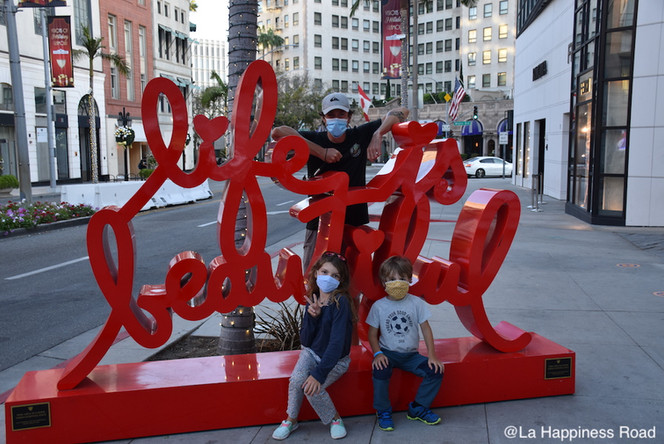 Bien que inaccessibles, les vitrines des boutiques sont belles et la rue déjà décorée pour les fêtes de fin d'année... Tout brille ici. On ne voit pas de stars ou de célébrités, et ce n'est pas ce que nous sommes venus cherchés, alors on reprend la route pour Santa Monica. Le soleil est déjà très bas, car ici, il se couche à 17h à notre grande surprise.