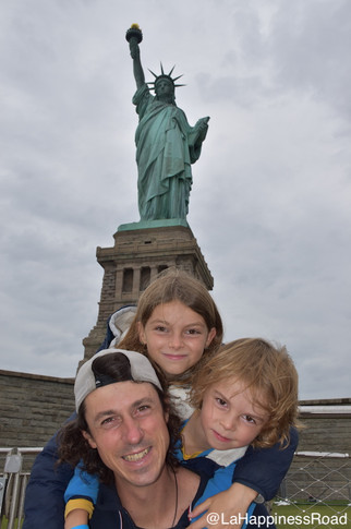 Statue de la liberté Ahhhh... On attendait cette visite avec impatience évidemment. Direction le sud de Manhattan pour prendre le bateau pour Liberty Island. Cette monumentale statue, haute de 93 mètres, est certainement l'édifice le plus célèbre et véritable symbole des Etats-unis. Cadeau des français, elle représente la liberté et l'émancipation face à l'oppression. Cette statue, à l'embouchure de l'Hudson river, est la première vision pour les immigrants arrivés par l'Atlantique. Pas de cours d'histoire, ni de longues descriptions de Madame Liberté qui comporte de nombreux symboles, juste les tables de la loi dans une main (sur laquelle est gravée la date d'indépendance ) et la torche représentant la lumière dans l'autre. A ses pieds, une chaîne brisée symbolise la liberté. Ce qui est impressionnant, c'est aussi le socle sur lequel elle repose... Il est énorme ! Nous ferons le tour de l'île, avec un audio guide en français afin de bien comprendre le comment du pourquoi. C'est vraiment magnifique avec cette vue sur la baie et les immenses buildings. Cette statue, ce qu'elle représente, c'est assez inspirant. On ne peut plus monter dans sa couronne à notre grand regret, mais c'est déjà un super moment dont les enfants, et nous, nous souviendront longtemps.