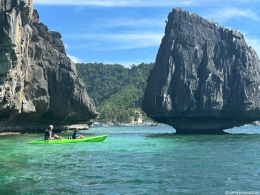 On va la longer un moment avant de nous arrêter à une première plage, sachant que l'on peut en atteindre trois. Son nom : Lapus Lapus Beach. Un peu isolée, du sable fin et des eaux bleues cristallines. Joli spot où on ne se fait pas prier pour se baigner. D'autant plus que le soleil tape fort, il faut sortir la crème indice 50 ! Petite marche pour sécher et ramasser quelques coquillages avant de reprendre nos moyens de locomotion en direction de la 2nde puis 3ème crique. Le vent s'est levé et on galère un peu plus à avancer... Mais l'effort, comme souvent, en vaut la peine. Encore plus grande, cette plage est bordée de cocotiers. C'est une aubaine, on entreprend de ramasser une noix qui semble prête à être mangée. On arrive à l'ouvrir (on a des restes de nos voyages précédents) et on grignotte ce met à la fois simple et si bon. Ça nous redonne l'énergie nécessaire pour affronter le chemin retour qui s'annonce plus compliqué car face au vent. On appréhende un peu, mais pas le choix il faut y aller. Et ce qu'on avait prédit arriva... On galère ! On tente tant bien que mal de conserver nos embarcations face au vent. Car dès que l'on se retrouve en travers, impossible d'avancer... Le vent nous déporte... On a les bras qui chauffent, on aurait envie de s'arrêter de pagayer mais on sait que si on s'écoute, on perd toute notre avance... Alors on plonge encore et encore nos pagaies pour avancer mètres après mètres... Et on finit par accoster sur notre plage, exténués et contents d'être enfin arrivés.