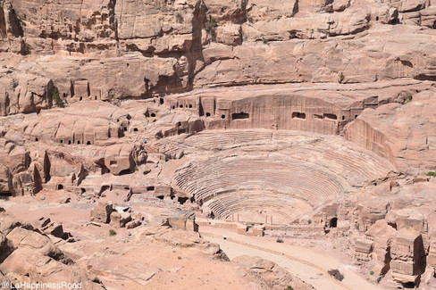 On est encore le matin et nous avons toujours de l'énergie pour avancer avec quelques pauses afin de nous hydrater. Le soleil est levé depuis un moment et la chaleur se fait déjà bien ressentir. Une fois en haut, après une grosse heure de marche, la vue est magnifique sur le site et surtout sur le théâtre. Mais on ne s'arrête pas là, en continuant 20 minutes de plus, on finira sur un petit café installé sous quelques tentes montées sur un python rocheux donnant sur... Le Trésor, évidemment. Une vue époustouflante, le surplombant, ça vallait la peine. Les lumières sont différentes, il, est différent...