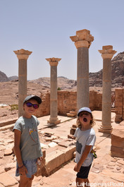 Il nous reste, je pense, encore une bonne heure de marche avant de retrouver un café sur le site et nous ravitailler. Il ne nous reste plus qu'une gorgée d'eau chacun, ça va être très tendu, mais pas le choix, faut avancer et économiser notre salive. Pour compliquer la tâche, on s'égare un peu du chemin principal pas toujours bien balisé, et nous n'arrivons pas tout à fait à l'endroit voulu... On a atterri dans un campement bédouin ! Nous n'avons plus d'eau depuis un petit moment, il fait encore extrêmement chaud, nous sommes déshydratés et... Ils n'ont pas d'eau, juste du thé à nous offrir, mais les enfants n'aiment pas cette boisson. Ils nous indiquent l'endroit le plus proche pour acheter des bouteilles, à 5 minutes de là en direction du site. Dernier effort, les enfants bedouins nous accompagnent, contents de voir des touristes et des enfants blondinets de leurs âges. Ça y est, la délivrance ! Je crois qu'on a dû vider 5 litres d'eau en quelques minutes. Il était temps, la marche sous le soleil nous a fait perdre beaucoup d'eau. Que c'est bon ! On a encore un temple en ruine à traverser et nous revoilà sur zone. Nouvelle pause dans un grand café afin de grignoter une barre céréale, boire un jus frais et faire un peu de monnaie pour payer nos dettes auprès des enfants.