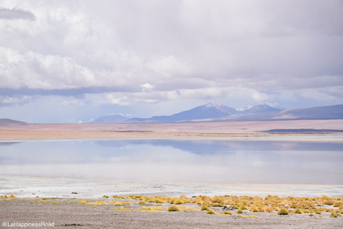 Les paysages de montagnes, plaines et lagunes s'enchaînent, le 4x4 avançant sur cette piste qui s'infiltre toujours plus profondément vers le Sud, en direction du Chili. Nouvel arrêt au salar de Chalviri. Ici, on peut marcher sur une croûte blanche, qui contrairement à son grand frère le salar d'Uyuni, n'est pas du sel à 100%. Les villageois du coin y ramassent du bicarbonate de sodium afin de le vendre sur les marchés. Parfois, on a l'impression de s'enfoncer, et la peur de passer au travers de cette fine pellicule se fait grandissante.