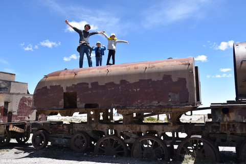 Une dernière étape, une dernière attraction nous attend : le cimetière de trains. C'est un endroit où l'on peut se promener au milieu de vieilles carcasses rouillées de trains. On peut monter dessus, dedans, s'asseoir sur une cheminée, s'adosser à une roue... C'est amusant et ça donne de belles photos avec ce métal froid et oxydé dans ce ciel bleu.