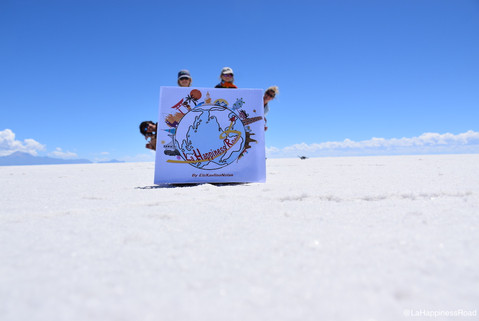 On prend le temps de s'ouvrir une bière, grignoter quelques gâteaux et partir se promener à pieds, en famille sur cette route toute droite s'enfonçant dans ce désert de sel, le plus grand du monde. Ce paysage tout plat s'étend sur 11000 km2, et il est composé d'un sel d'un blanc éclatant et de quelques îles que nous découvrirons demain. On contemple là, face à nous, l'assèchement d'un lac préhistorique, aujourd'hui exploité pour son lithium. On avance donc sur cette route, sur laquelle on décide de monter quelques cairns, histoire de s'amuser avant de retourner dans notre demeure. Comme chaque soir, on bavarde avec les acolytes du second 4x4, on joue aux cartes puis on passe à table. Au menu du soir : soupe aux frites, spaghettis bolognaise. Nos repas sont variés et plaisent à tout le monde, ce qui représente un bon défi pour notre cuisinière.