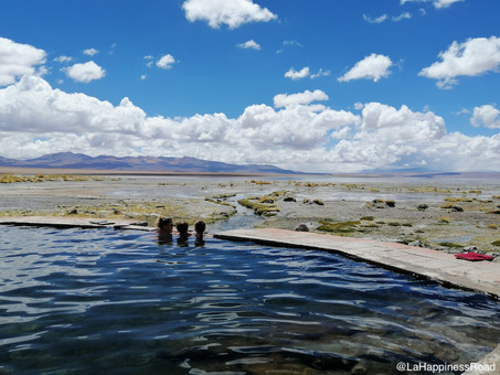 Vite en voiture pour continuer jusqu'aux sources thermales. On arrive sur un parking aménagé, une maison, une grande salle de restaurant vide et 2 bassins d'eaux fumantes. En temps normal, l'endroit est pris d'assault, et il faut s' acquitter de 20 bob pour avoir le droit de se baigner. Mais ça, c'est en temps normal... Il ne nous faut que quelques minutes pour enfiler nos maillots et sauter dans l'eau autour de 30 degrés. Un régal quand la température extérieure est d'à peine 10°c ! On prend le temps de se délasser dans cette eau sulfurisée, de partager une bière avec nos pilotes et de contempler la vue sur les montagnes, parfois enneigées.