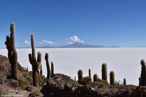 Mais il faut regagner l'habitacle car nous approchons de notre destination : Isla Incahuasi. En langue Quechua, cela signifie "la maison de l'Inca". C'est une île perdue au milieu du désert. Une véritable île lorsque la pluie tombe et recouvre le salar, une île de corail, magnifique avec ses cactus géants qui la recouvrent. Des cactus qui ne grandissent que de 1cm par an, et dont l'un des plus grand mesure 12 mètres... On vous laisse calculer. On doit s' acquitter de quelques bolivianos afin de pouvoir jouir des wc, et surtout pour arpenter le sentier qui fait le tour de cette colline. Il fait très beau, et plutôt chaud. On monte au travers de cette drôle de végétation pour atteindre le sommet. De là, un panoramique à 360° pour admirer l'étendue du désert et ce blanc qui nous brûle les yeux.