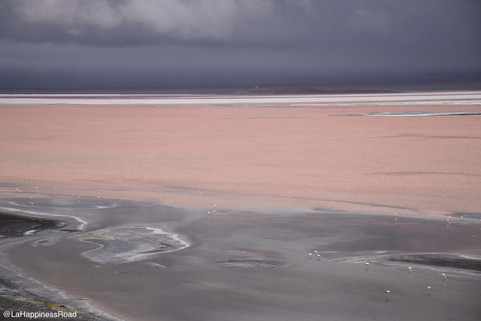 A la sortie de cette zone, s'enchaîne 4 lagunes : Honda, Charcola, Hedionda et Canapa. On longe de loin la première pour finalement rouler puis s'arrêter sur les berges de la troisième. On marche le long de la rive, les couleurs sont différentes des précédentes, et celle-ci abrite une communauté de flamants. Ils sont un peu moins rose que ceux vus la veille, certainement dû à leur nourriture.