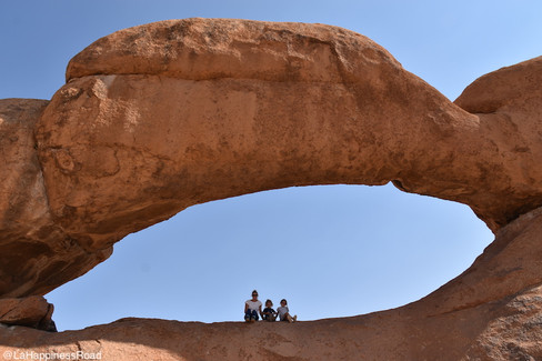 C'est relativement grand, mais nous décidons de nous promener sur les rochers autour d'une belle arche naturelle. La couleur de la roche varie en fonction du soleil et des nuages. Le coin est parfait pour que les enfants jouent. On courre, on grimpe, on saute, on se cache et on s'octroie même une petite sieste.